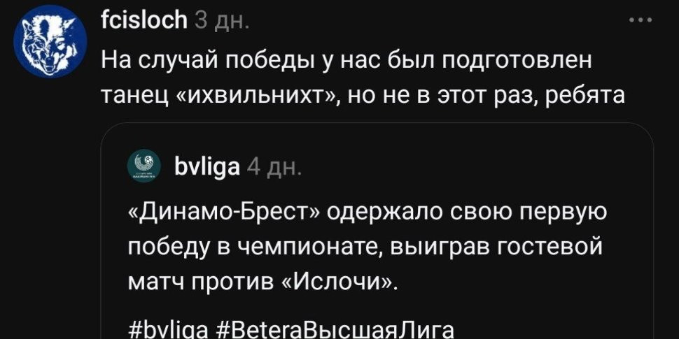 Отметим, что после трех туров текущего розыгрыша Высшей лиги «Ислочь» занимает девятое место и имеет в своем активе четыре очка. Посмотрим, что на это скажет клубный Threads.